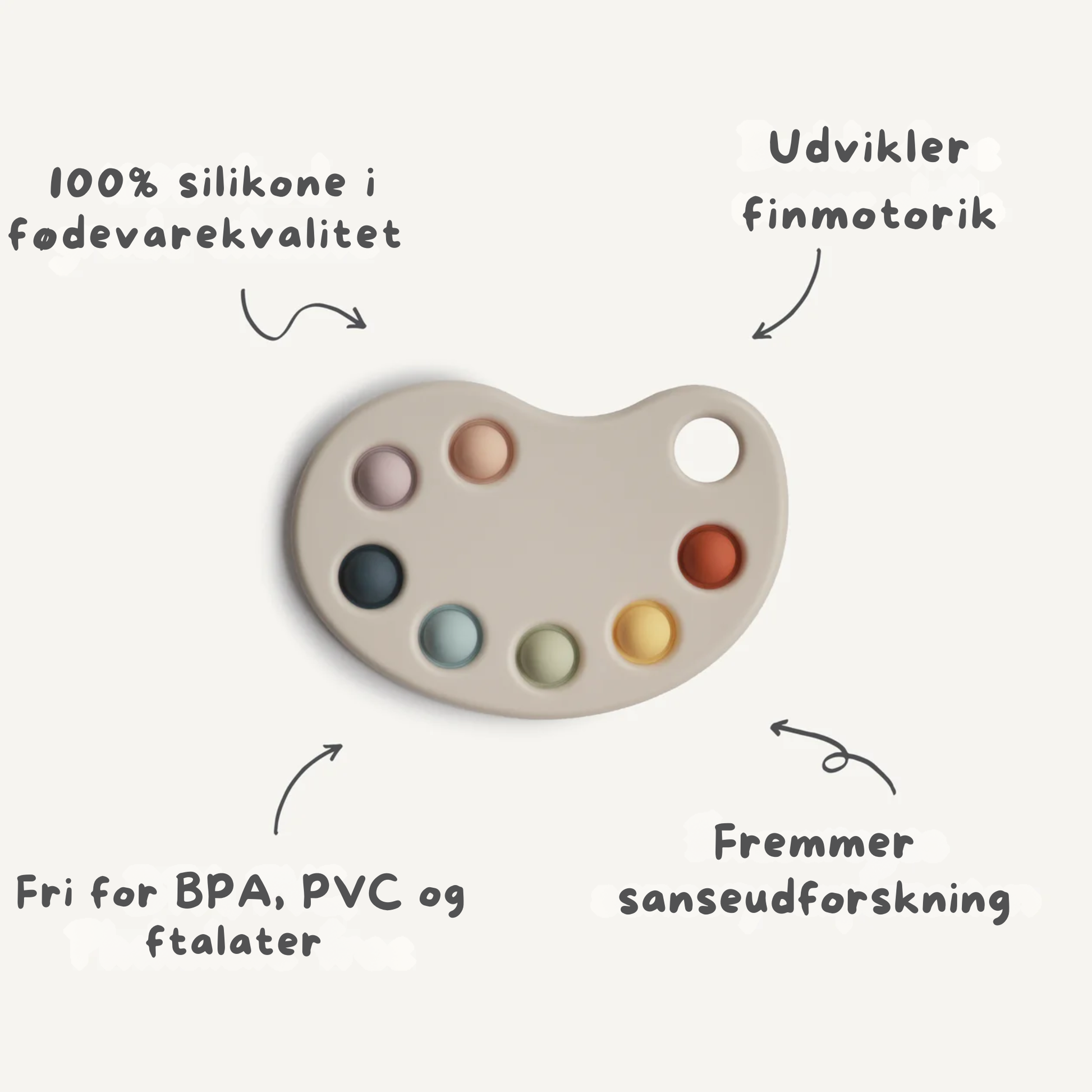 Lad de små fingre udforske! Mushies Malerpalette er et enkelt og roligt sanselegetøj med farvede silikonebobler, der kan trykkes igen og igen med en blid pop-lyd. Det styrker finmotorik og nysgerrig sanseleg, og den kompakte “malerpalette” er nem at tage med på farten. Fremstillet af silikone i fødevarekvalitet og ABS-plast, fri for skadelige stoffer. Ca. 15,5 × 10 × 1,3 cm. Rengøres nemt i varmt sæbevand og lufttørres. Anbefalet fra 10+ mdr.